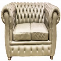 It features deep tufts in the upholstery; a back that is level with the arms; and a low seat with exposed legs. Some manufacturers use other materials, such as canvas, tweed, and denim.